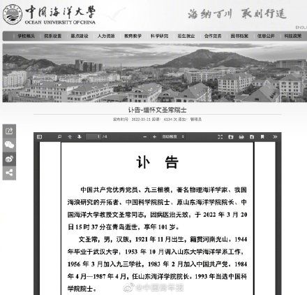 3月21日,@中国海洋大学 网站发布讣告:中国科学院院士、著名物理海洋学家、该校教授文圣常,因病医治无效,于3月20日在山东青岛逝世,享年101岁。学校网站变成灰色。文圣常同志是我国著名海洋学家、教育家、我国海浪研究的开拓者和物理海洋学的奠基人之一,为我国海洋科教事业作出了杰出贡献。致敬!缅怀!